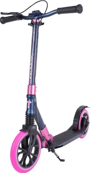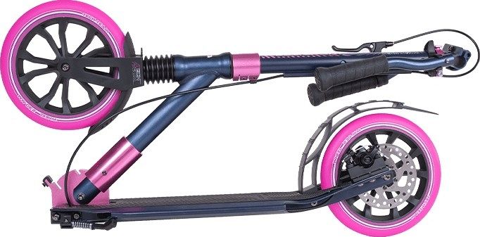 Широкая алюминиевая дека (15 см) обладает прочностью и позволяет разместить обе ноги, обеспечивая комфорт и отдых во время поездки. Длина деки составляет 61 см, а "footspace" - рабочая часть деки - 34 см. Покрытие деки выполнено износостойкой резины, что облегчает уход за поверхностью. Дека также оснащена складывающейся подножкой для удобства. Система складывания самоката выполнена по традиционной для этой линейки модели Pull&Fold, что позволяет быстро и легко складывать и разворачивать самокат.