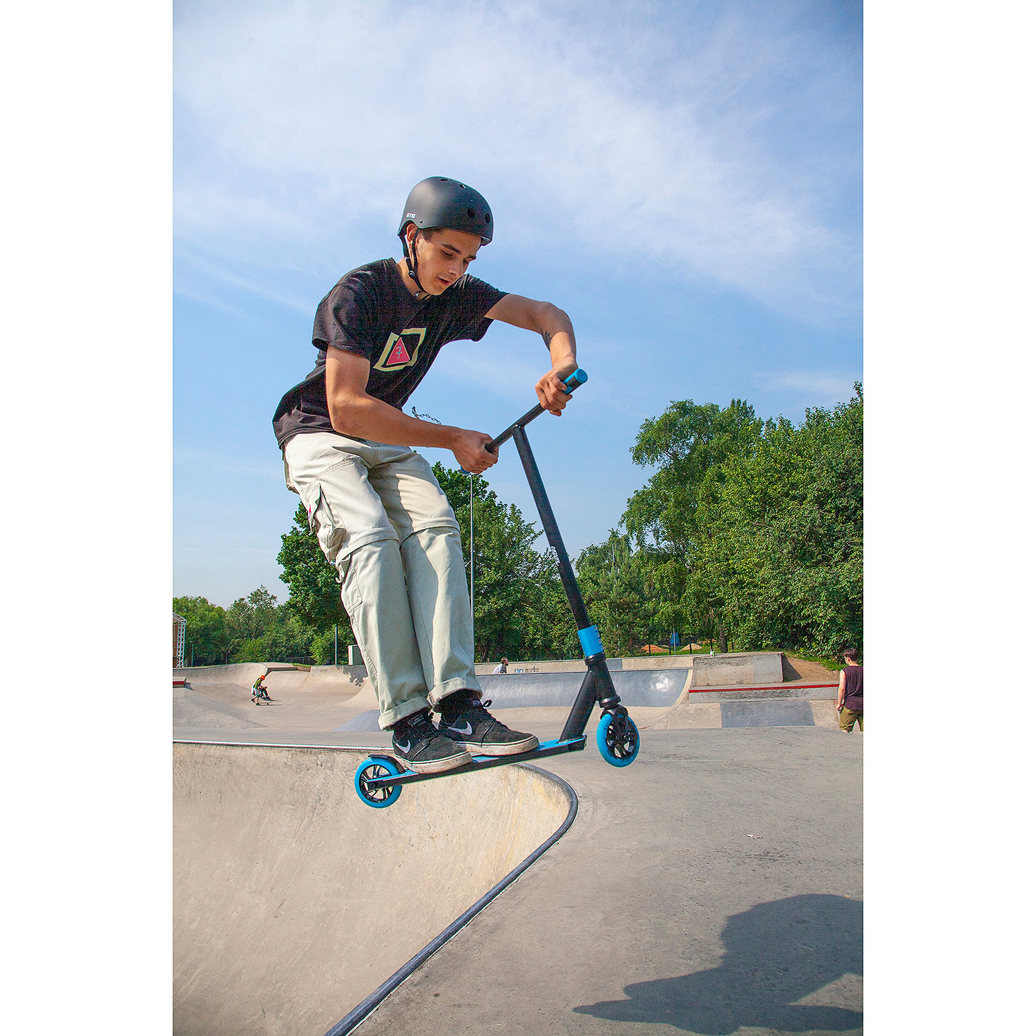 Novatrack Replay 120A 2019 - сделан из алюминиевого сплава с усиленной рулевой колонкой и алюминиевыми колесами, что делает его максимально прочным и легким. Широкий Т-образный руль позволяет лучше контролировать самокат во время прыжков или других трюков. Модель выдерживает до 100 кг веса. 4-ех болтовой зажим, установленный на NOVATRACK REPLAY, надежно соединяет руль и вилку.