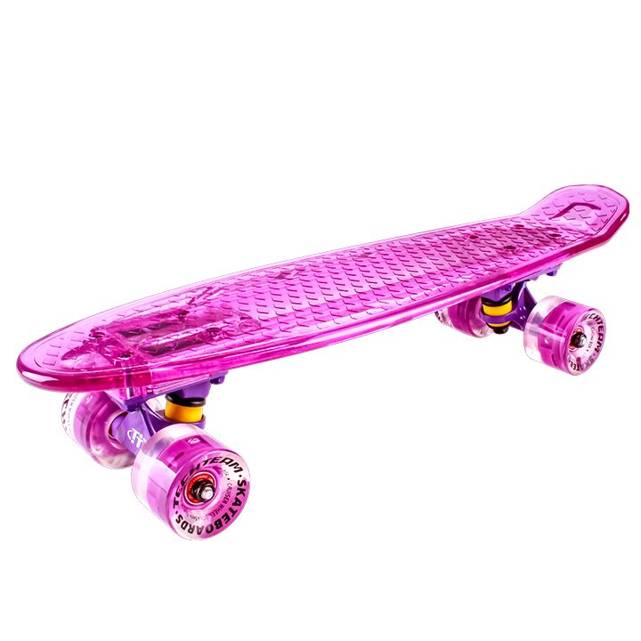 TechTeam Transparent 22 Light - эта яркая модель не только отличается тем, что сочетает в себе прочность и прозрачный материал, но также и наличием подсветки. Led-лампочки установлены как в саму деку, так и в колеса. Только представьте, как круто рассекать улицы на таком скейте особенно в вечернее время. Колеса оборудованы скоростными подшипниками ABEC 7, которые придают хороший накат. Пластиковый скейтборд весьма легок из-за своих небольших габаритов, размер деки 22 дюйма. Отличный вариант для городских прогулок, который будет вызывать восхищение у прохожих и доставлять Вам истинный комфорт и безопасность.