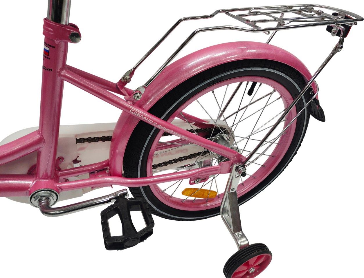 – Полезные аксессуары. В комплекте боковые колёса, стальные крылья и корзинка.