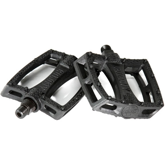 На каждой стороне корпуса отлито по 12 пластиковых шипов среднего диаметра – оптимальный баланс между зацепом и износостойкостью. Внутри установлены насыпные подшипники, которые при необходимости легко обслуживаются. Ось выполнена из хромомолибденовой стали и имеет стандартную резьбу 9/16", подходящую для большинства BMX шатунов.