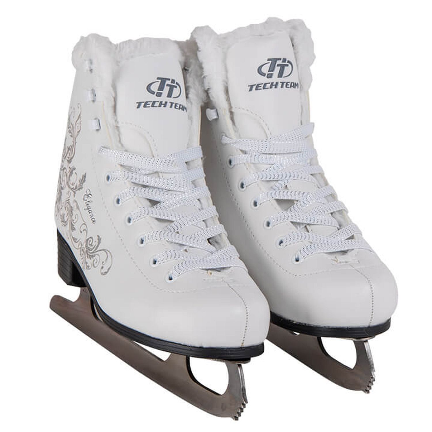 Новая продвинутая модель коньков Elegance от российского бренда Tech Team будет по душе любой девушке. Дизайн коньков с узорами в виде серебра и надписью «Elegance» выделят Вас из большинства! Коньки очень удобно снимать и одевать при наличии одной только шнуровки, вверху установлены специальные крючки. Материал коньков сделан из морозостойкой искусственной кожи. Внутренняя часть состоит из мягкого и теплого меха. Удобный и прочный каблук сделан из полипропилена.