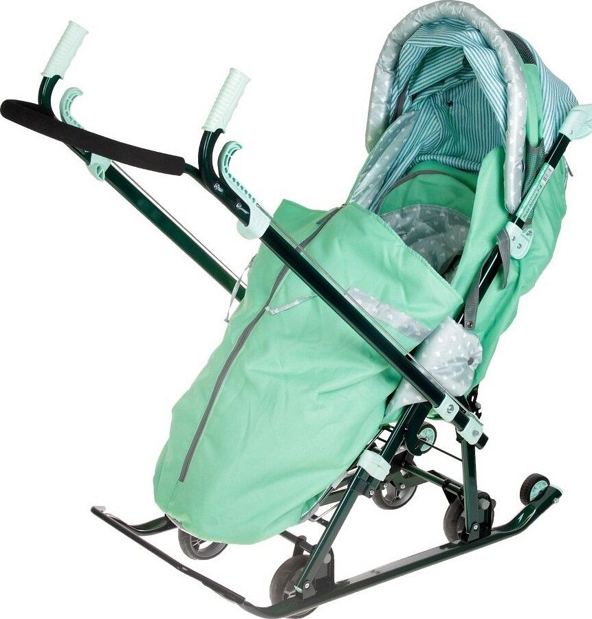 Плоские полозья шириной 40 мм и высокопрочный стальной цветной каркас обеспечивают надёжность и долговечность конструкции. Механизм смены полозьев на колеса (выдвижная колесная база) позволяет легко адаптировать коляску к различным условиям. Высокий складной трёхсекционный козырёк с увеличенной высотой по спинке создаёт комфортные условия для малыша, даже если он в шапке с помпоном.