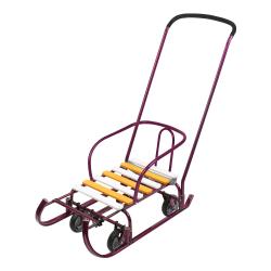 Металлические санки с механизмом выдвижных колесных шасси с родительской ручкой-толкателем для катания и перевозки детей.